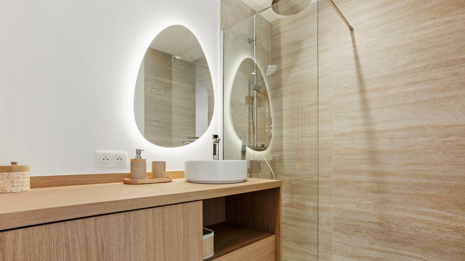 - Une salle d’eau élégante avec lave-linge, ouverte sur la chambre.